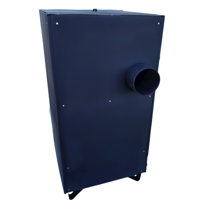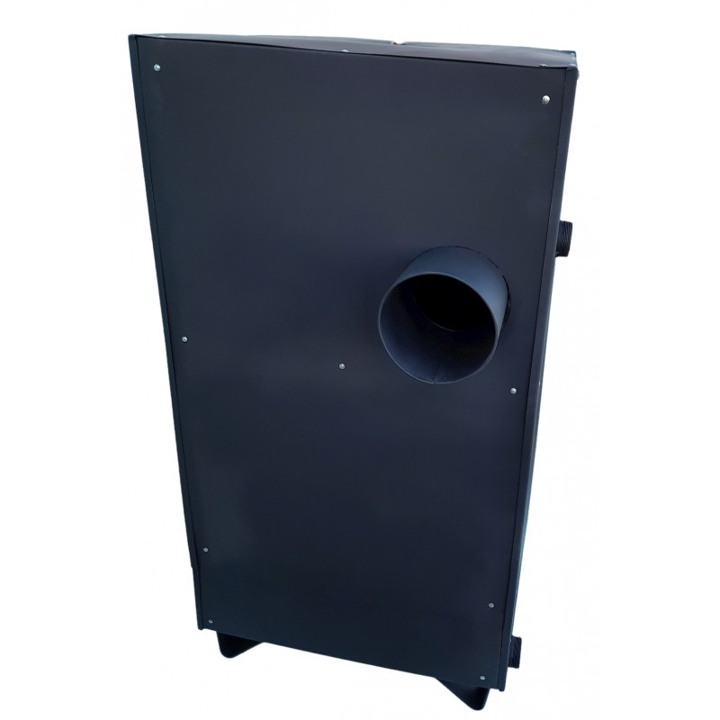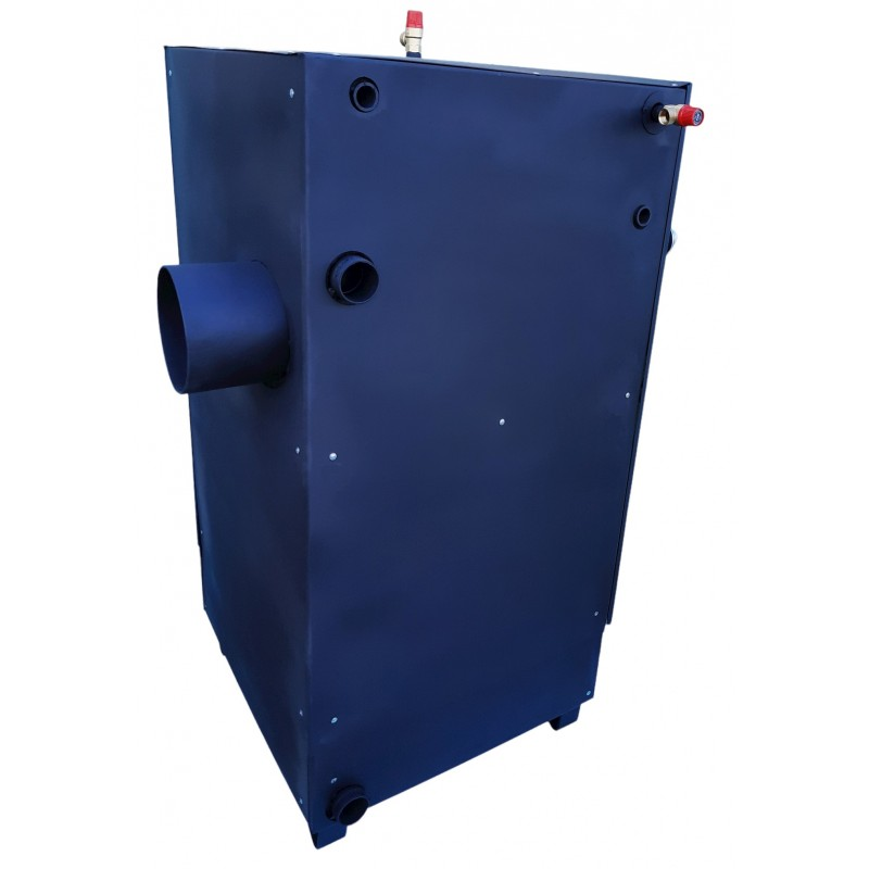 Котел состоит из трех основных частей ― топочной, теплообменника и встроенного бойлера косвенного нагрева на 70 литров. Камера сгорания или, вернее, топка в пиролизных котлах состоит из двух секций: зона загрузки и зона сгорания. В первой части (загрузки) топливо сгорает медленно и пиролизуется, образовывая при этом газы, которые в зоне сгорания (второй) под воздействием вторичного воздуха разгораются, выделяя основное тепло для нагрева воды в контуре. По своей сути пиролизные котлы являются экономическими так как в нем сгорает все составляющие топлива. Помимо этого, процесс горения происходит в течении от 12 часов до 30 часов, в зависимости от способа подачи воздуха. Для сравнения для обычных твердотопливных котлов, работающих на древесном топливе, это время составляет порядка 3 часов. Недостатком этого типа котлов является их более высокая стоимость по сравнению с обычными, сложность конструкции и высокая требовательность к влажности дров. Но благодаря тому, что в данной модели горение происходит не в форсунке, а через просвет в нижней части топки и вторичный воздух подается не через форсунку, как в стандартном газогенераторе, а при помощи отверстий на входе в теплообменник, мы немного снизили эффективность дожига пиролизных газов, но при этом данная модель котла получила следующие преимущества: