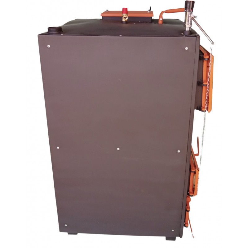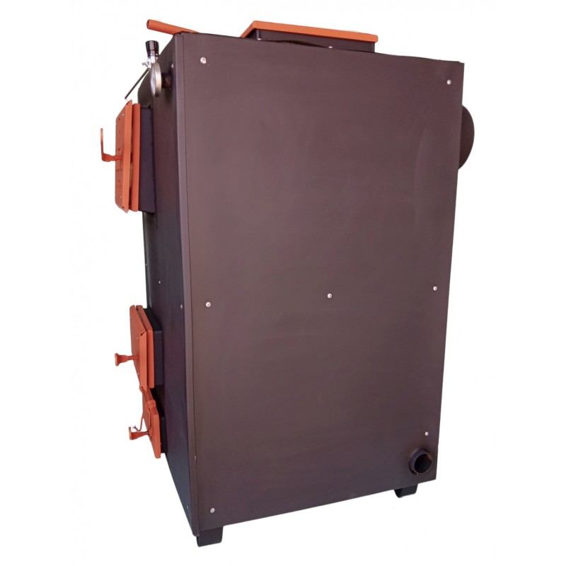 Рабочее давление до 1,3 атм. Максимальное давление 2 атм. Оптимальная конструкция позволяет максимально эффективно использовать загружаемое топливо, на одной полной загрузке топки, котел может работать 12 и более часов без дозагрузки. Также большим плюсом данной модели является то, что она может работать на топливе низкого качества с повышенной влажностью. Таким образом, если использовать сырые дрова, водонагреватель, за счет нижнего интенсивного горения подсушивает верхние влажные дрова и когда те опускаются в зону горения, то их влажность уже находится в допустимых для нормального сжигания параметрах, но при этом естественно не происходит пиролизация топлива, что уменьшает интервал между загрузками. Использование топлива с высокой влажностью приводит к быстрому износу стенок топки котла.