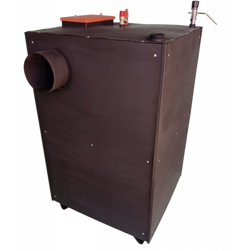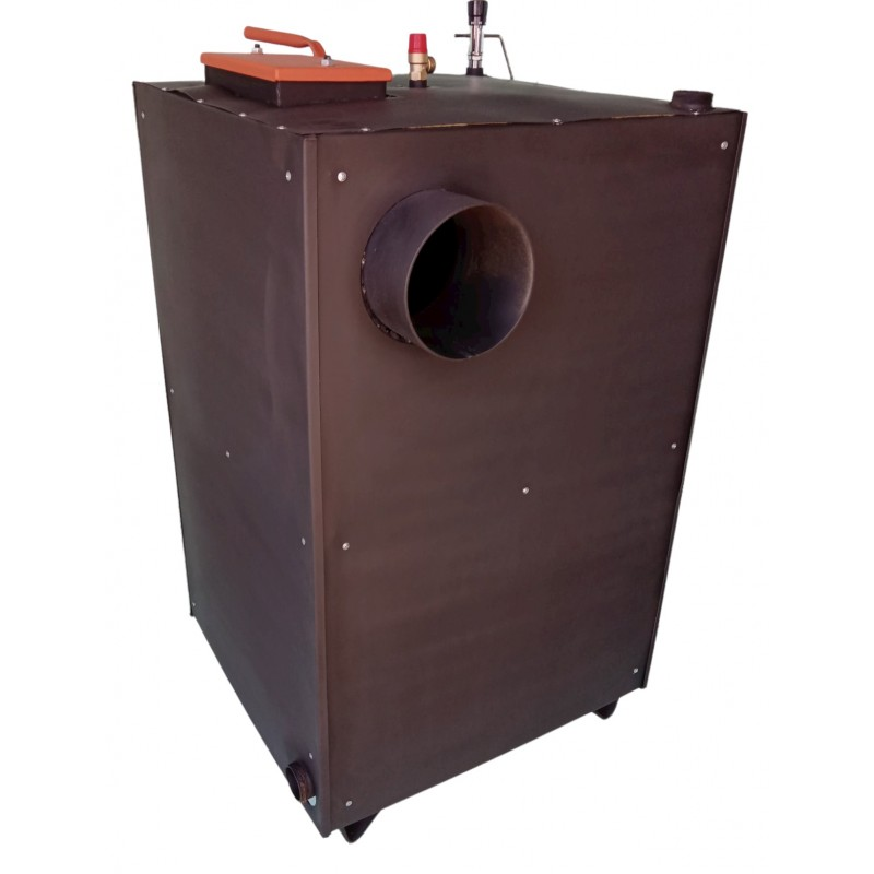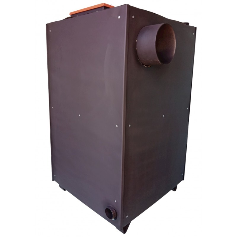 Котел состоит из двух основных частей ― камера сгорания и теплообменника. Камера сгорания или, вернее, топка в пиролизных котлах состоит из двух секций: зона загрузки и зона сгорания. В первой части (загрузки) топливо сгорает медленно и пиролизуется, образовывая при этом газы, которые в зоне сгорания (второй) под воздействием вторичного воздуха разгораются, выделяя основное тепло для нагрева воды в контуре. По своей сути пиролизные котлы являются экономическими так как в нем сгорают все составляющие топлива. Помимо этого, процесс горения происходит в течении от 12 часов до 30 часов, в зависимости от способа подачи воздуха. Для сравнения для обычных твердотопливных котлов, работающих на древесном топливе, это время составляет порядка 3 часов. Недостатком этого типа котлов является их более высокая стоимость по сравнению с обычными, сложность конструкции и высокая требовательность к влажности дров. Но благодаря тому, что в данной модели вторичный воздух подается не через форсунку, как в стандартном газогенераторе, а при помощи отверстий на входе в теплообменник, мы немного снизили качество дожига пиролизных газов, но при этом нам удалось также значительно снизить требования к качеству сжигаемого топлива. Поэтому данный котел может работать на одной закладке топлива как хороший газогенератор 12 и более часов, а основной вид топлива, которое он потребляет не технической сушки, а обычная древесина, подвергнутая естественному старению под навесом в течении года и более.