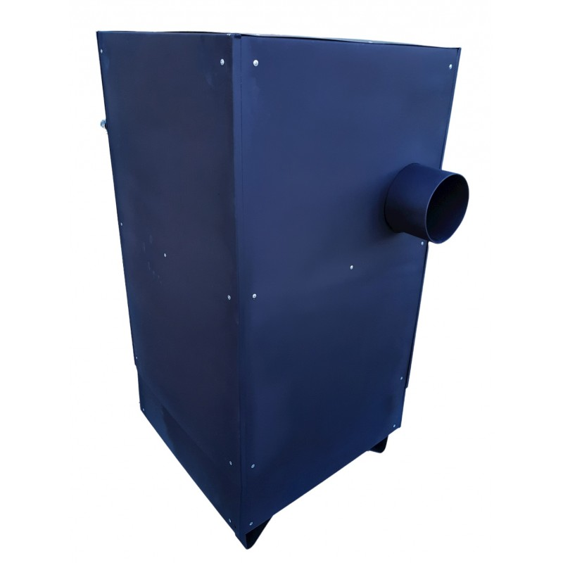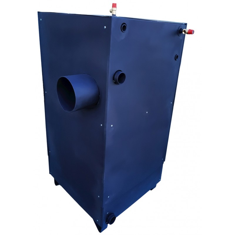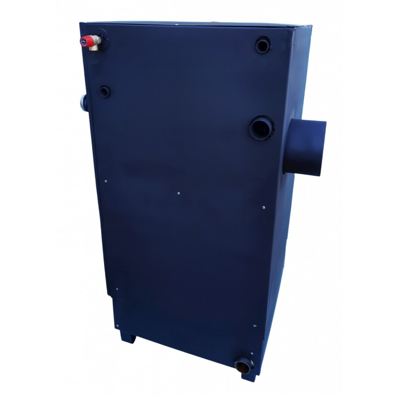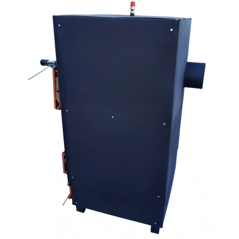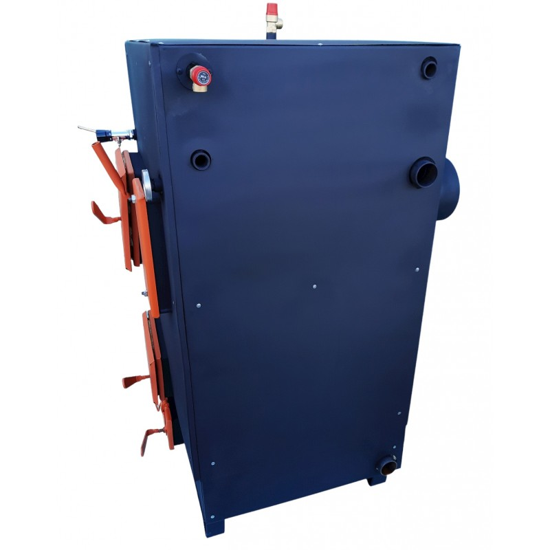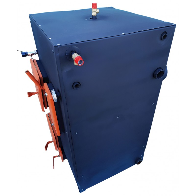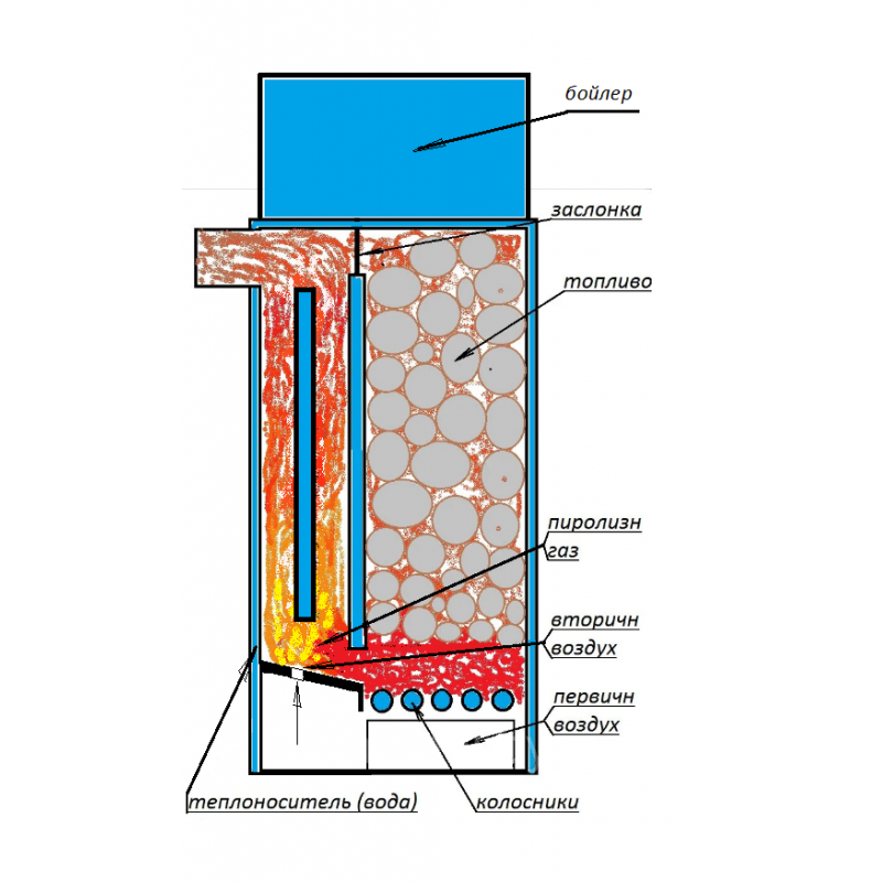 Котел состоит из трех основных частей ― топочной, теплообменника и встроенного бойлера косвенного нагрева на 70 литров. Камера сгорания или, вернее, топка в пиролизных котлах состоит из двух секций: зона загрузки и зона сгорания. В первой части (загрузки) топливо сгорает медленно и пиролизуется, образовывая при этом газы, которые в зоне сгорания (второй) под воздействием вторичного воздуха разгораются, выделяя основное тепло для нагрева воды в контуре. По своей сути пиролизные котлы являются экономическими так как в нем сгорает все составляющие топлива. Помимо этого, процесс горения происходит в течении от 12 часов до 30 часов, в зависимости от способа подачи воздуха. Для сравнения для обычных твердотопливных котлов, работающих на древесном топливе, это время составляет порядка 3 часов. Недостатком этого типа котлов является их более высокая стоимость по сравнению с обычными, сложность конструкции и высокая требовательность к влажности дров. Но благодаря тому, что в данной модели горение происходит не в форсунке, а через просвет в нижней части топки и вторичный воздух подается не через форсунку, как в стандартном газогенераторе, а при помощи отверстий на входе в теплообменник, мы немного снизили эффективность дожига пиролизных газов, но при этом данная модель котла получила следующие преимущества: