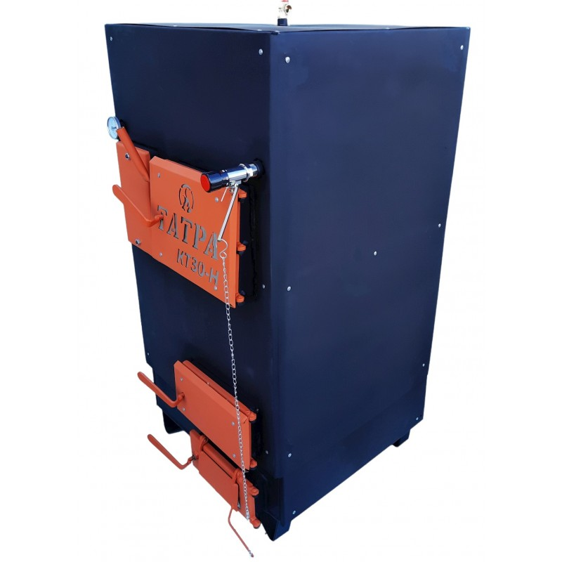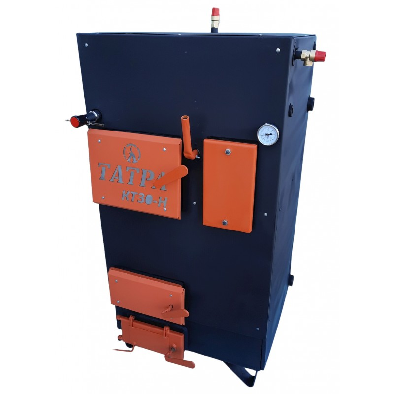 Твердотопливный котел Татра КТ30-НП2 (6 мм) правое подключение, двухконтурный. Мощность: 30 кВт; Площадь помещения: до 250 м2; Виды топлива: дрова, торф, брикеты; КПД: 87%
