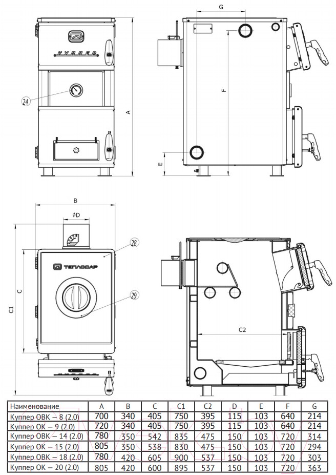 Отопительный котел Теплодар Куппер ОВК-20 (2.0) - для отопления помещений общей площадью до 200 м.кв. Работает на топливе: дрова, уголь, электричество (блок ТЭН 6 кВт покупается отдельно), газ и пеллеты при наличии соответствующей горелки (приобретается отдельно). Котел имеет рубашку и теплообменник для быстрого нагрева теплоносителя. Подключение системы отопления (радиаторов отопления) возможно как слева так и справа от котла. Режим экономичного горения организован герметичным закрыванием дверец топки. Топка изготовлена из конструкционной стали толщиной до 3 мм, колосник из чугуна.