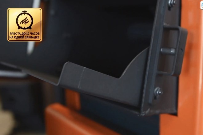 Время горения на одной закладке угля - до 12 часов. Такая длительность достигнута благодаря системе подачи вторичного воздуха в камеру сгорания и водотрубной колосниковой решетке, которая снимает тепло даже с тлеющих углей.