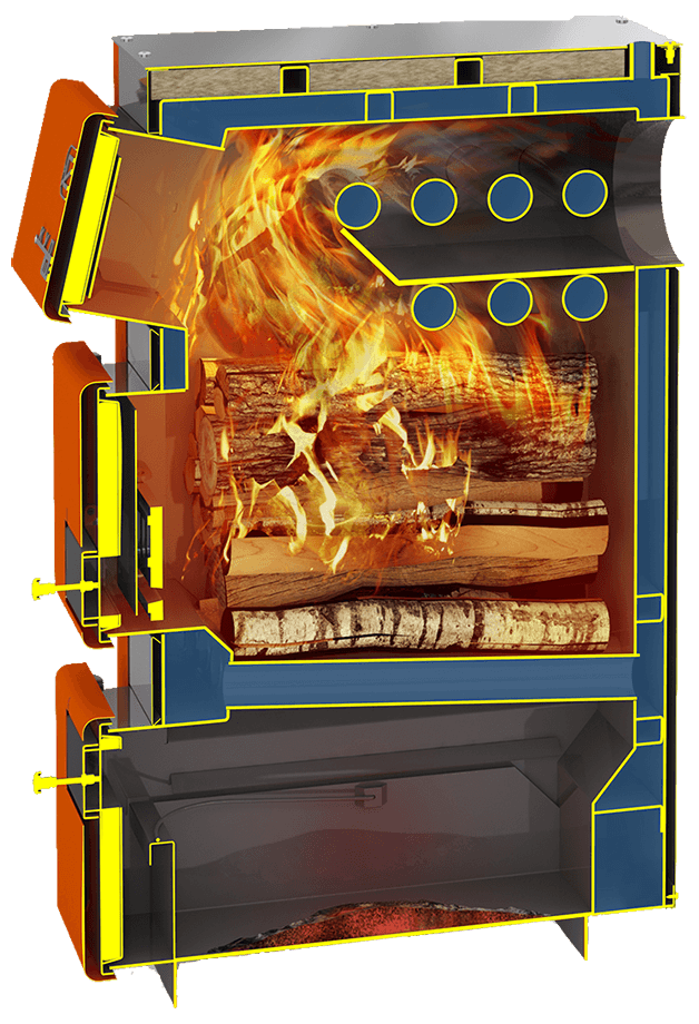 Время горения на одной закладке угля - до 12 часов. Такая длительность достигнута благодаря системе подачи вторичного воздуха в камеру сгорания и водотрубной колосниковой решетке, которая снимает тепло даже с тлеющих углей.