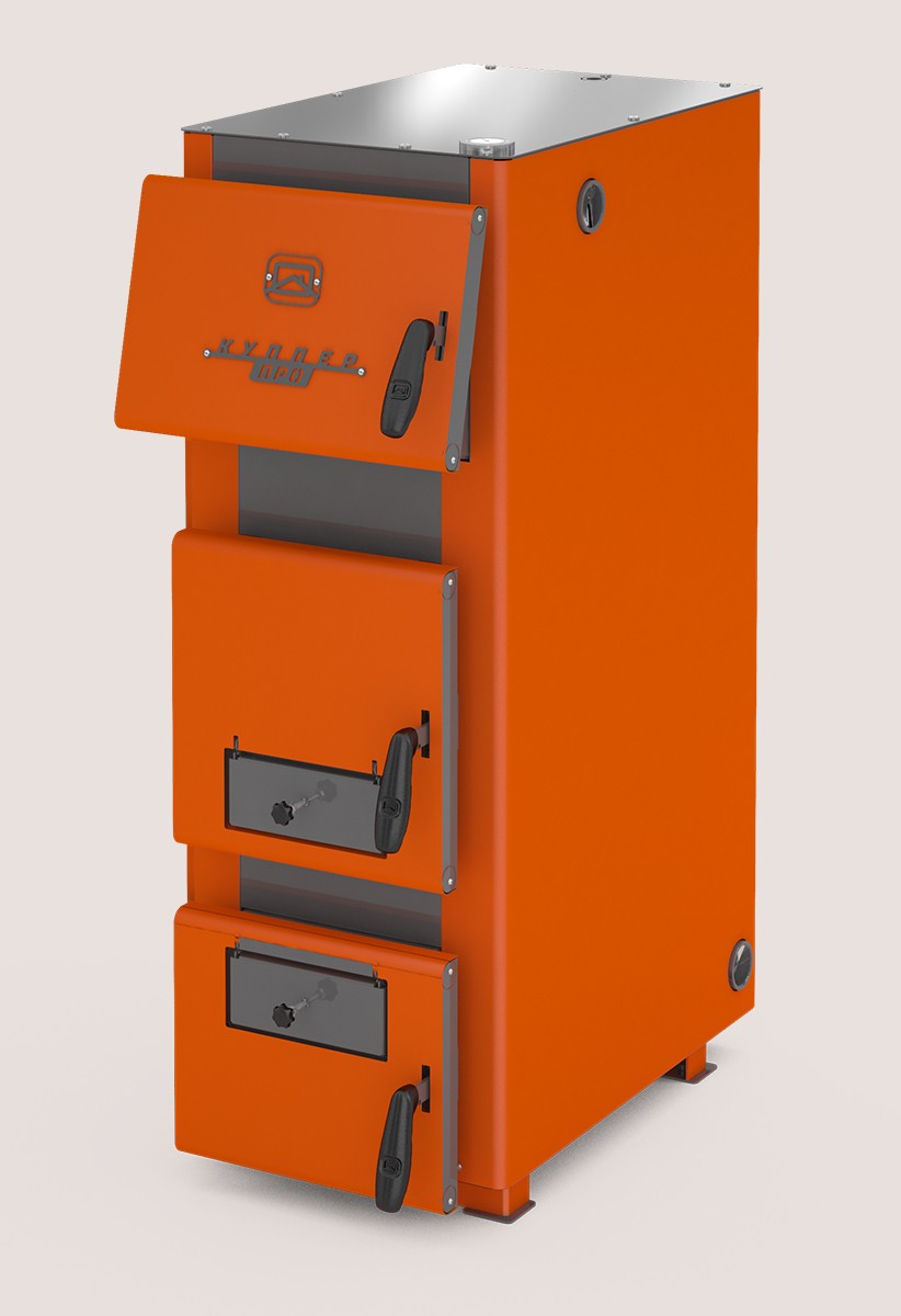 Отопительный котел «Куппер ПРО 36» 2.0 относится к современным эффективным твердотопливным отопительным котлам. Отопительный котел мощностью 36 кВт подойдет для помещений до 360 кв.м. В качестве основного топлива могут использоваться уголь, дрова, топливные брикеты. Для поддержания температуры теплоносителя после прогорания основного топлива в котел может быть установлен блок ТЭН (приобретается дополнительно). Также в конструкции котла предусмотрена возможность установки пеллетной или газовой горелки: за 30 минут котел можно перенастроить на газ или пеллеты. Время горения на одной закладке угля - до 12 часов. Такая длительность достигнута благодаря системе подачи вторичного воздуха в камеру сгорания и водотрубной колосниковой решетке, которая снимает тепло даже с тлеющих углей. Котел работает на давлении системы отопления до 3 атм, а также имеет дополнительный запас прочности, поэтому не выйдет из строя от скачков давления в системе отопления. В комплект поставки котла уже входят аксессуары для прочистки, шибер и капиллярный термометр. Элементы дымохода, регулятор тяги, блок ТЭН и пульт управления к нему не входят в комплект котла и при необходимости приобретаются отдельно (вкладка Комплектующие). Конструкция котла «Куппер ПРО» предусматривает возможность их установки. Объем камеры сгорания составляет 100 литров, а в удлиненную топку легко умещаются дрова длиной до 495 мм! Благодаря широкой наклонной дверце загружать твердое топливо чрезвычайно удобно, а универсальный съемный лоток особой конструкции из нержавеющей стали защищает дверцу от перегрева и снижает риск случайного просыпания топлива. Новые эргономичные рукоятки из жаростойкого силикона на всех дверцах подарят дополнительный комфорт. В комплект котла уже включен капиллярный термометр расположен на верхней части котла.