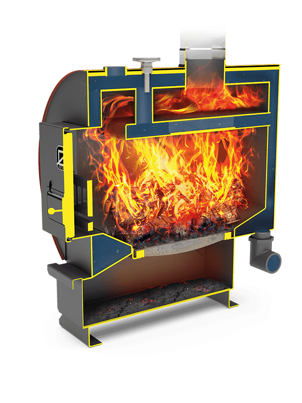 Твердотопливный котел предназначен для отопления через радиаторы, теплый пол, буферную емкость помещений общей площадью до 100 м2. Устанавливают в частных домах, загородных домах, дачах и др. Основные виды топлива: дрова, торфобрикет, уголь, газ – при установке дополнительно горелки, пеллеты – при установке дополнительно горелки. Регулировка простая и надежная при помощи зольника. Объемная и глубокая топка позволит закидывать дрова длиной 50 см. Универсальность подключения котла к системе отопления позволяет подключать трубы как с лева, так и с права самого котла. Благодаря герметичности котла воздух подается в котел строго через поддувало и регулируется его количество, что обеспечивает долгий процесс горения. Дымоход подключается к котлу сверху, что очень удобно. Также можно подключать газовую или пеллетную горелку без каких-либо сварочных работ. Бункер устанавливается сбоку от котла, но для него вам потребуется место. Хороший вариант для отопления дома.