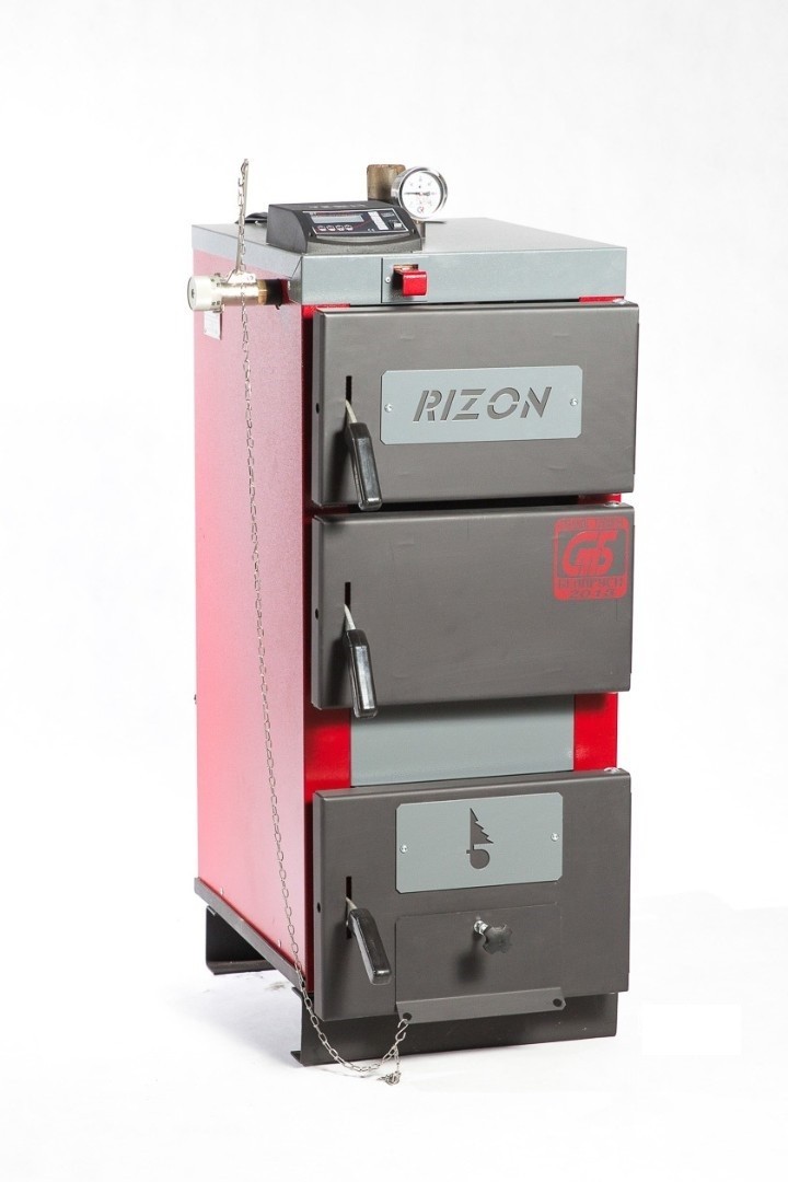 Твёрдотопливный котёл Теплоприбор Rizon EXTRA 30A (5 мм) для отопления помещений до 300 м2. Приготовление горячей воды в бойлере косвенного нагрева. Вид топлива: дрова, древесные отходы, уголь, торфобрикет.