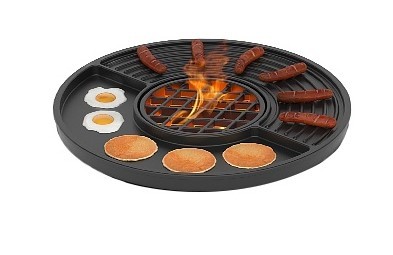 Плита имеет круглую форму и разделена на две части. Одна часть представляет собой плоскую плиту с углублением для сбора жира и соуса. На этом секторе плиты хорошо готовить классические блюда: пожарить яичницу, разогреть булочки для гриля, просто пожарить мясо или курицу. Вторая часть имеет ребристое основание, на котором можно приготовить мясо, овощи, рыбу с красивым узором из параллельных или пересекающихся линий. С одной стороны этого сектора так же размещено углубление для жира и соусов.