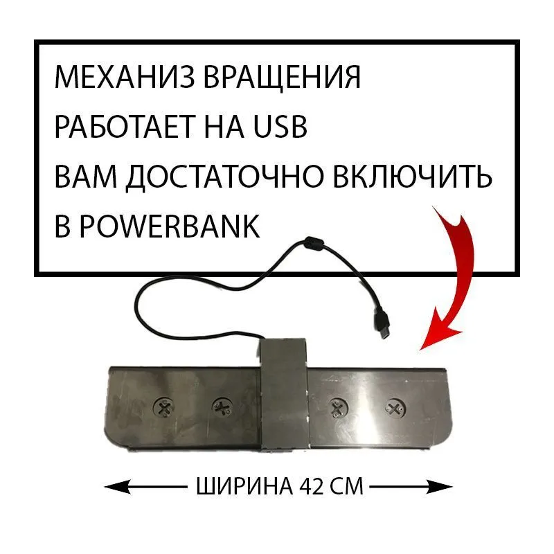 Конструкция оснащена специальным мотором с выведенным USB-проводом, который можно подключать к элементу питания. Обеспечит непрерывное вращение шампуров при приготовлении мяса! Даже самый ленивый шашлычник оценит по достоинству преимущество самокрутов. Шампуры вращаются постоянно, поэтому мясо обжаривается равномерно и не теряет сок, что делает его нежным и равномерно прожаренным.