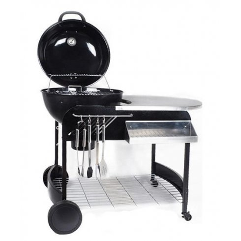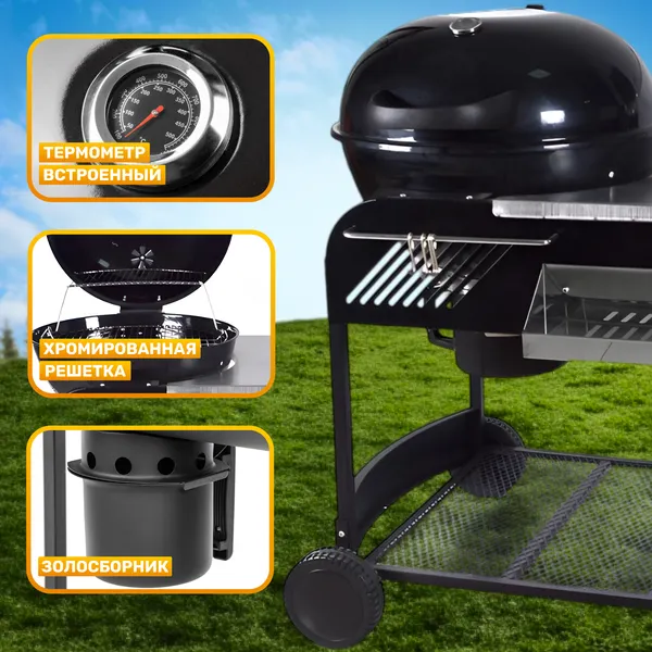 | Оснащение | Держатель шампуров (полка), дровница, золосборник, колеса (4 шт.), крючки для аксессуаров, решетка (1 шт. для барбекю, 1 шт. для угля), столешница (пристолье), встроенный термометр, крышка |