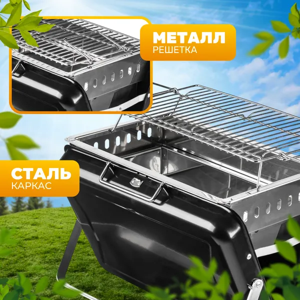 Переносной гриль на углях подходит для пикников, дачи и кемпинга, сочетая функциональность, удобство и долговечность. В комплекте предусмотрен кейс для хранения и транспортировки.