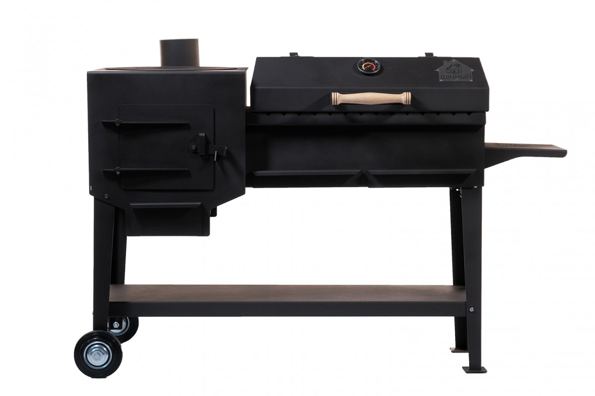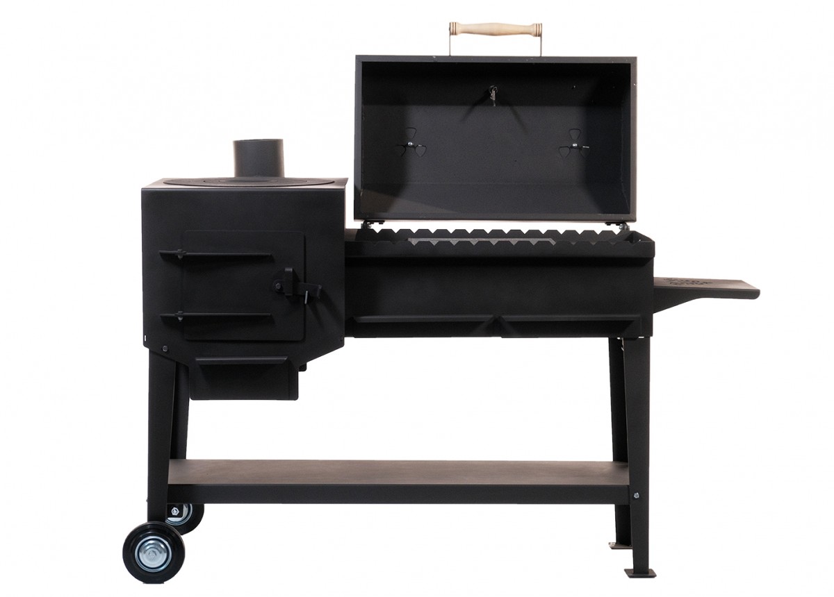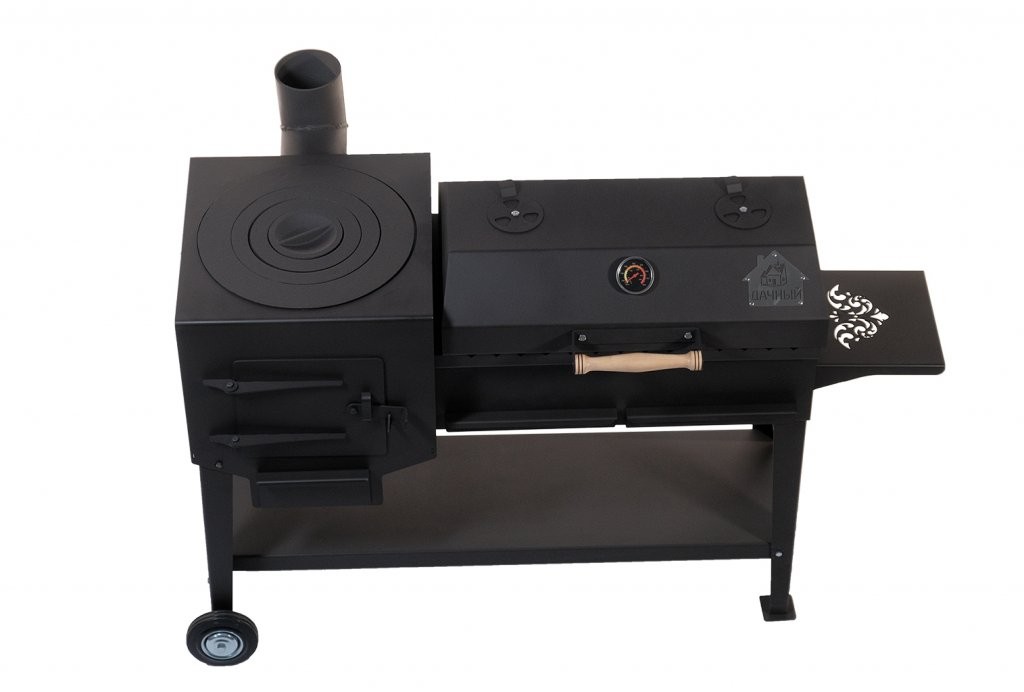 Казан-гриль «Дачный» - это многофункциональное устройство для приготовления блюд пищи на свежем воздухе на загородных участках. Различные мясные, рыбные, овощные и другие блюда можно приготовить в режиме барбекю (крышка закрыта) или гриль (при открытой крышке), используя различные аксессуары. Казан-гриль «Дачный» можно использовать с различными аксессуарами и приспособлениями, которые могут применяться для приготовления блюд на огне при помощи углей (шампуры, решетки-гриль и т.д). Вся конструкция изготовлена из конструкционной стали Ст.3СП 5 и выкрашена несколькими слоями термостойкой черной краски, что делает данное устройство надежным и долговечным. Масса изделия нетто составляет 69 кг. Казан-гриль «Дачный» оборудован специальным термометром для контроля температуры в процессе работы. Регулирование температурного режима можно осуществлять с помощью вентиляционных заслонок. Зольный ящик разделен на 2 сегмента, что позволяет легко удалить продукты горения после использования данной модели, сохраняя чистоту на дачном участке, а также регулировать интенсивность горения как с одной, так и с другой половины. Удобные полки позволяют с комфортом разместить все необходимые аксессуары. Специальная ручка для транспортировки, а также колеса позволяют легко переместить Казан-гриль по загородному участку. Конструкция ножек оснащена специальными упорами, что делает ее устойчивой на любой поверхности. Отличительной особенностью казан-гриля "Дачный" является объединение печи под казан и гриля. С одной стороны, это устройство можно использовать для приготовления блюд в казане, с другой - на гриле, либо делать это одновременно. Это обстоятельство позволяет готовить пищу на большую компанию в очень короткий промежуток времени.