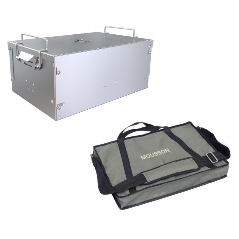 Коптильня оборудована двухуровневой решеткой из пищевой нержавеющей стали AISI 304. Решетка удобная в применении, а ее двухуровневая конструкция позволит приготовить большее количество разнообразных блюд. Также в конструкции присутствует специальный поддон, предназначенный для сбора лишней жидкости, образующейся в процессе приготовлении пищи. Вы можете коптить продукты, установив коптильню на мангалы MOUSSON Prometeo или MOUSSON Germes и использовать для этого щепки любимой древесины. В комплекте с коптильней Flex 8 IBR Вы получите прочную сумку с ПВХ-покрытием внутри для удобной транспортировки и хранения изделия.