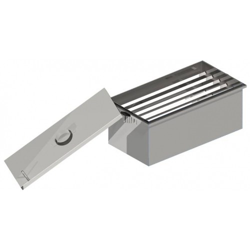 Коптильня изготавливается из нержавеющей стали толщиной 1 мм. Коптильня имеет 2 уровня расположения продуктов, поддон для сбора жира и так называемый «гидрозатвор» в верхней части корпуса. При копчении, в него наливается вода и благодаря этому, создается давление и копчение происходит более быстро и качественно. Так же «водяной затвор» играет роль ребра, жесткости благодаря которому коптильню не «ведет» в течение всего срока службы. Крышка имеет выпускную трубку. Надев на нее шланг, и выпустив его на улицу, Вы можете использовать коптильню в домашних условиях или на террасе и беседке. На дно коптильни устанавливается поддон для сбора жира. Это облегчает очистку коптильни после готовки, а так же защищает щепу от продуктов копчения. Решетки изготовлены из нержавейки. Их конструкция с дополнительным ребром жесткости позволяет коптить любые продукты, проходящие по размерам.