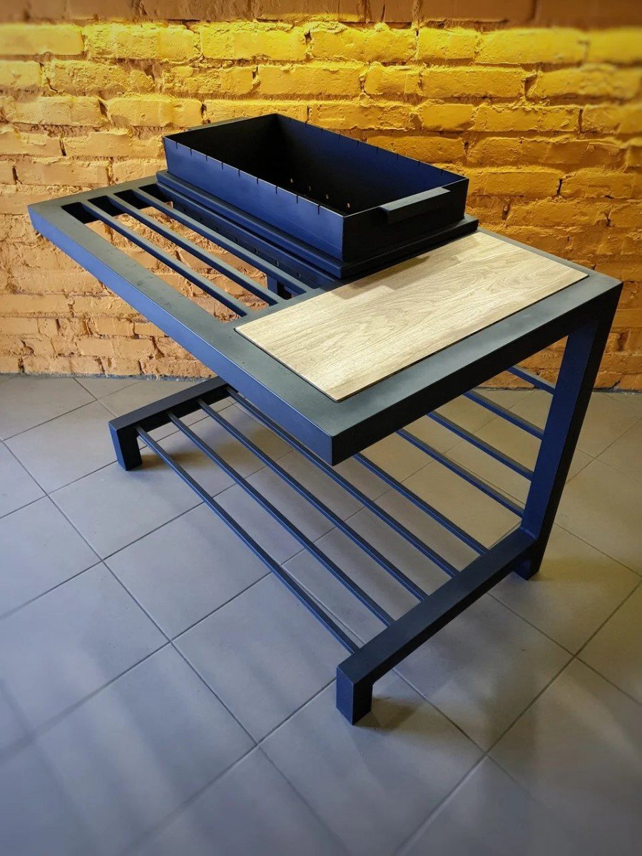 Мангал с подстольем в минималистичном стиле. Толщина стенок лотка 3 мм. Сам лоток усилен профильной трубой по периметру. Столешница выполнена из массива дуба.