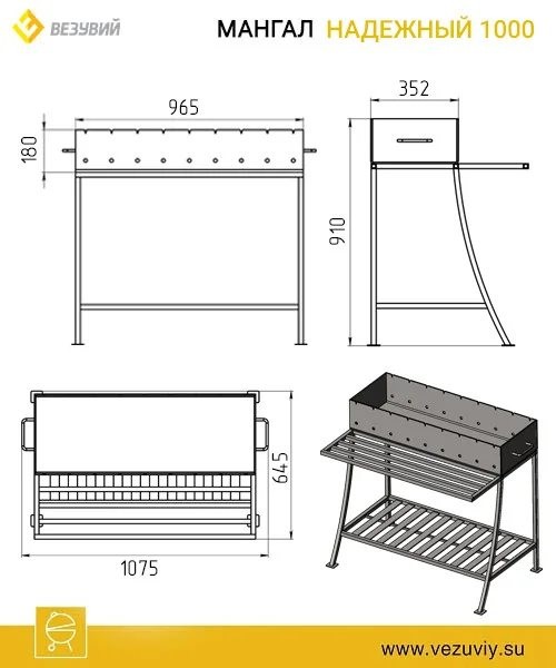 Мангал Везувий Надёжный 1000 получил свое название из-за того, что произведен из 6 мм котловой стали, покрытый термостойкой кремнийорганической эмалью. Мангал «Надежный 1000» спереди оснащен удобным столиком, поэтому все необходимое для приготовления пищи, будет всегда «под рукой». В основании мангала предусмотрена решетка, на которой можно хранить дрова или мешок углей. С боков мангал оборудован ручками, делающими удобным перемещение мангала в случае необходимости. Комплектуется крышкой, препятствующей попаданию в мангал мусора и атмосферных осадков, в то время, когда мангал не используется.