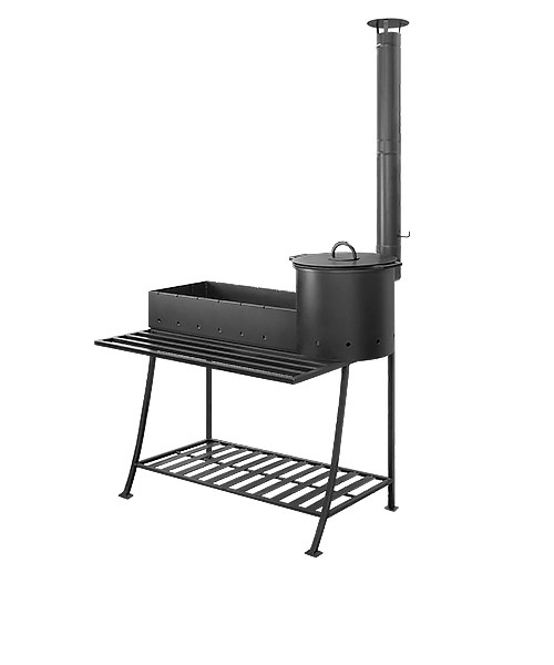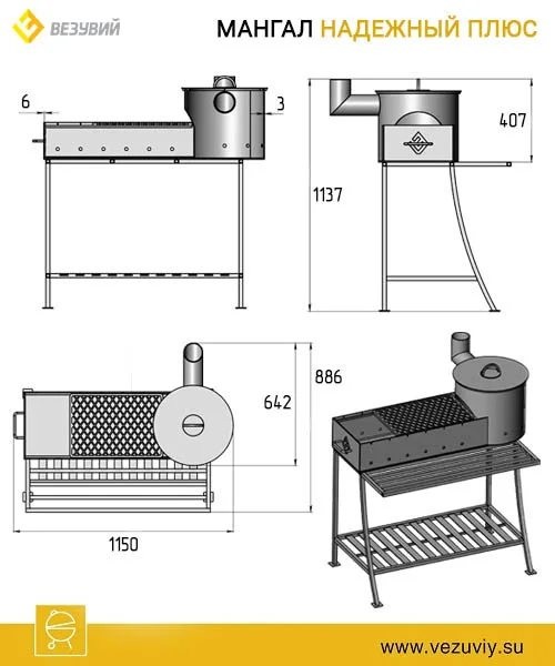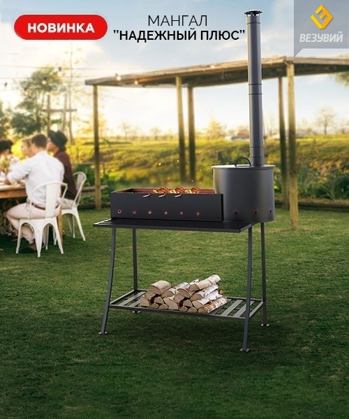 Мангал Везувий Надёжный Плюс получил свое название из-за того, что произведен из 6 мм котловой стали, покрытый термостойкой кремнийорганической эмалью, также особенностью мангала является печь под казан с высокой вытяжной трубой самоварного типа. На мангале можно одновременно готовить пищу на шампурах и в казане. Так как мангал стационарный для защиты от осадков в комплекте поставляется крышка для мангальной вставки и печи под казан.