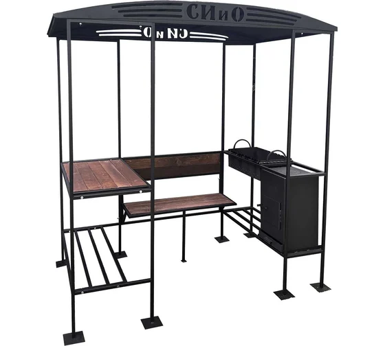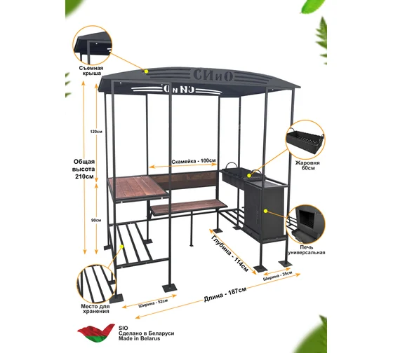 | Оснащение | Крыша, жаровня (2 мм), печь, дровница (2 шт.), стол, скамейка, дымоход |