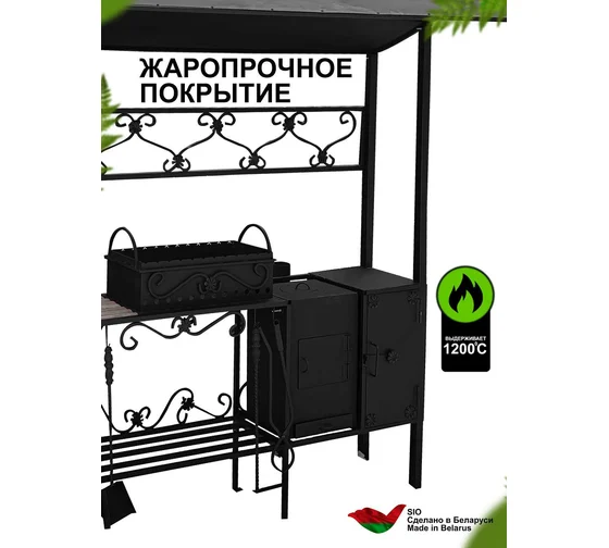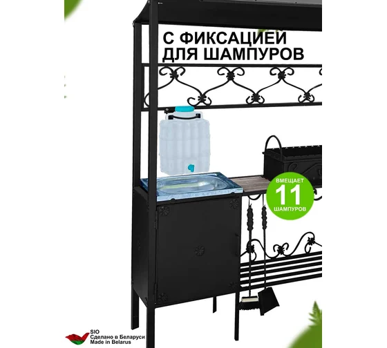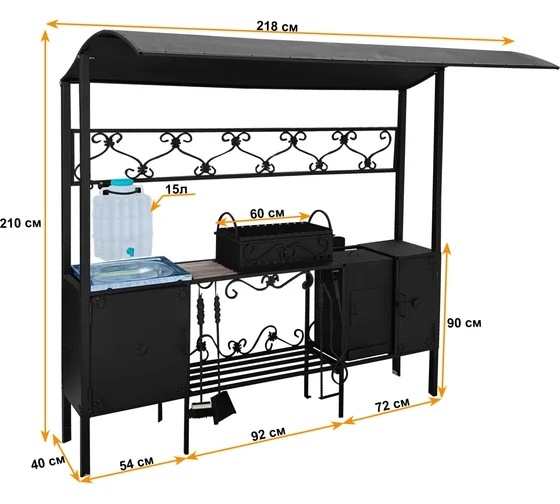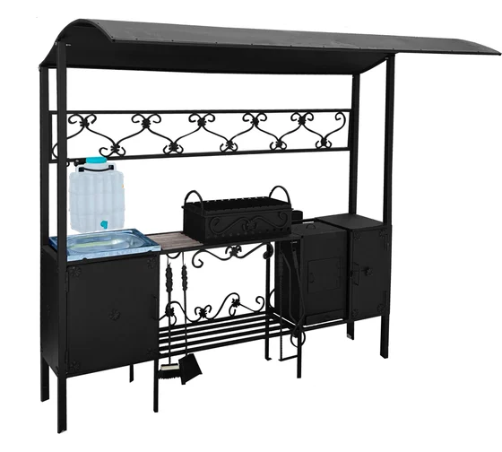 | Оснащение | Направляющая для шампуров, печь, столешница, полка, крыша, раковина |