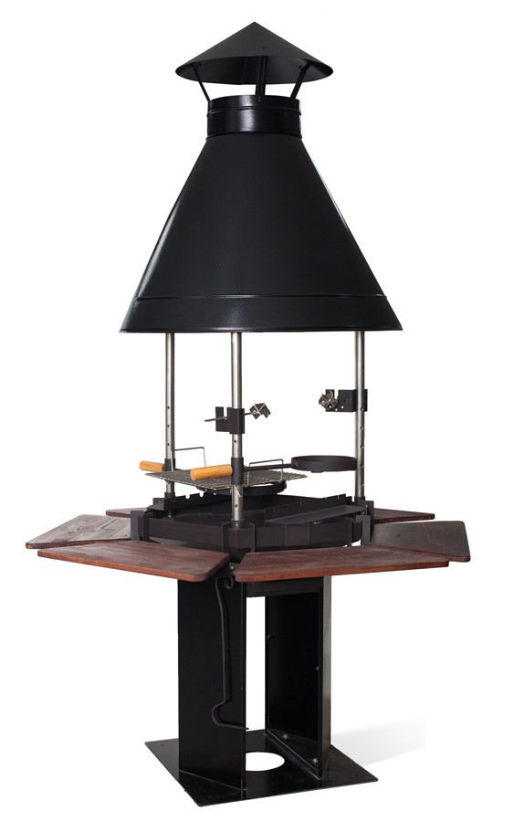 Предусмотрена возможность установки, как на открытом воздухе, так и в различных беседках и террасах. Очаг-гриль изготовлен из листовой стали. Корпус очага, поворотные держатели для посуды и опора для шампуров окрашены термостойкой эмалью. Дымовой колпак, стойка очага и все элементы дымохода окрашены порошковой краской. Вертел и решетка-гриль изготовлены из нержавеющей стали. Навесные пристолья изготовлены из дерева лиственных пород и покрыты лаком. Для повышения долговечности в корпус очага уложены чугунные колосники. Масса гриля 111 кг.
