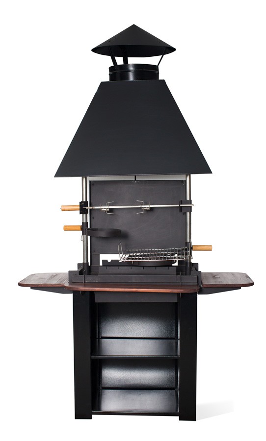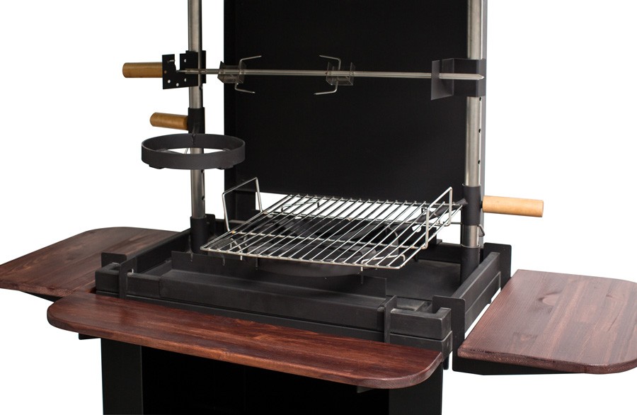 Предусмотрена возможность установки, как на открытом воздухе, так и в различных беседках и террасах. Очаг-гриль изготовлен из листовой стали. Корпус очага, поворотные держатели для посуды и опора для шампуров окрашены термостойкой эмалью. Дымовой колпак, стойка очага и все элементы дымохода окрашены порошковой краской. Вертел и решетка-гриль изготовлены из нержавеющей стали. Навесные пристолья изготовлены из дерева лиственных пород и покрыты лаком. Для повышения долговечности в корпус очага уложены чугунные колосники. Масса гриля 95 кг.