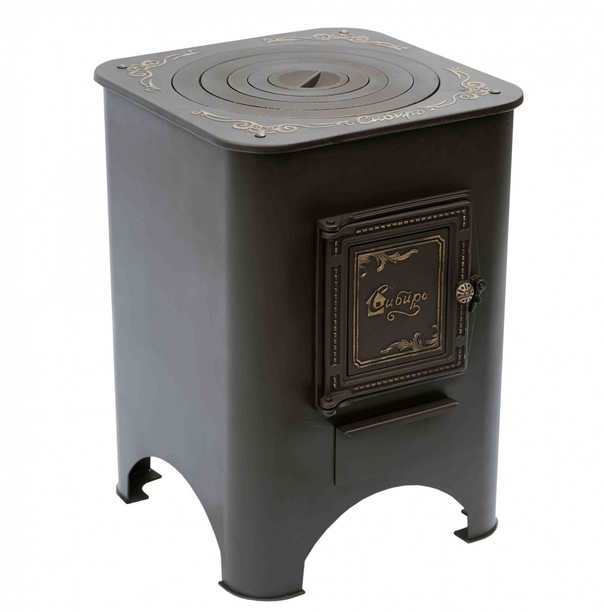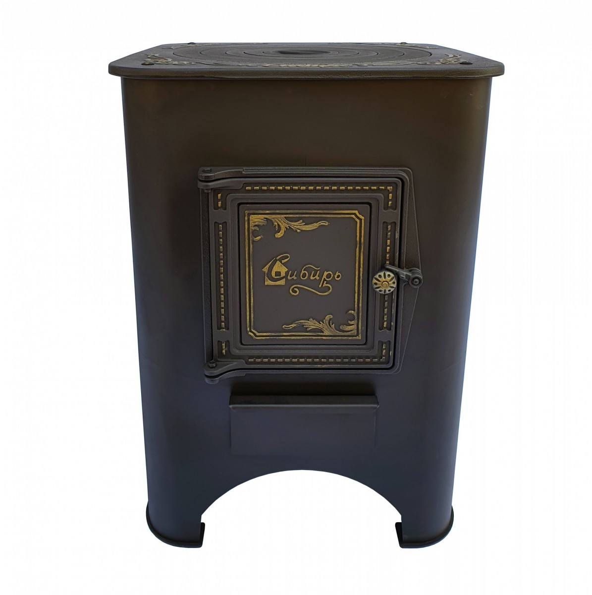 Печь под казан «Сибирь» оснащена чугунная плитой с кружками. Казанная плита дополнена узорами и фирменной надписью «Сибирь». Диаметр отверстия под казан составляет 400 мм и позволяет разместить казан любого размера. Фирменная чугунная топочная дверца «Сибирь» обладает универсальной конструкцией и способна модифицироваться в каминную дверку с термостойким стеклом. В топочной камере глубиной 520 мм можно разместить даже длинные дрова, а вместительный зольный ящик позволит легко удалить продукты горения, сохраняя чистоту в зоне готовки. Ножки печи под казан «Сибирь» оснащены специальными упорами, создающими необходимую устойчивость на различных поверхностях.