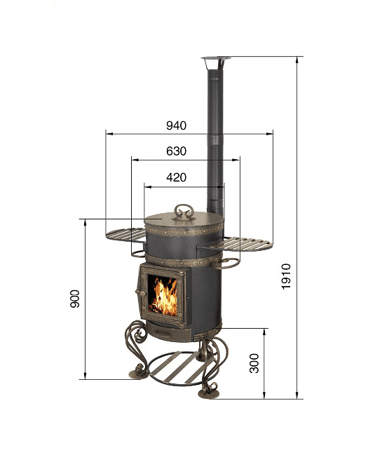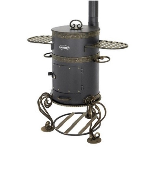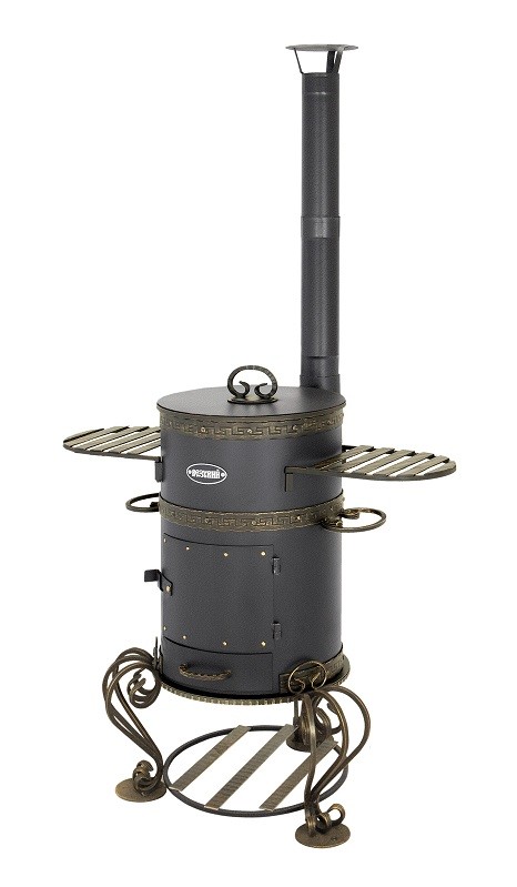 Печь под казан Везувий Шмель 12 предназначена для приготовления еды на свежем воздухе. Объем казана 12 литров хватает для того, чтобы накормить обедом всех членов большой семьи. С двух сторон печь оборудована двумя полочками. Внешне они напоминают крылья шмеля, за что печь и получила свое название. Печь оснащена вытяжной трубой самоварного типа. Благодаря этому образующийся дым поднимается высоко в воздухе и не мешает окружающим. Колосниковая решётка и выдвижной зольный ящик позволяет легко и быстро удалять золу при горящей печи. Также его можно использовать для регулирования интенсивности горения дров в топке.
