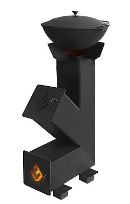 Конструктивно печь представляет из себя F-образную трубу. В верхний горизонтальный тоннель закладываются дрова. Тоннель приварен под углом, это обеспечивает самостоятельное перемещение дров вниз по мере горения (под действием силы тяжести). Зола в такой конструкции скапливается в нижнем горизонтальном тоннеле и не забивает топку, не нарушая при этом тягу и интенсивность горения, это, в свою очередь, ведет к более экономичному использованию дров.После растопки дров в F-образном канале возникает тяга, за счет которой интенсивность горения в ракетной печи возрастает по мере прогрева корпуса. Таким образом, принцип работы реактивной печи заключается в использовании энергии естественного потока восходящих продуктов горения. Чем выше температура стенок топливника, тем древесина горит интенсивнее, а пламя становится мощнее. Данная печь отличается своей экономичностью в потреблении дров и отдачей на выходе максимального количества тепла за счет реактивной тяги созданной самой конструкцией печи.