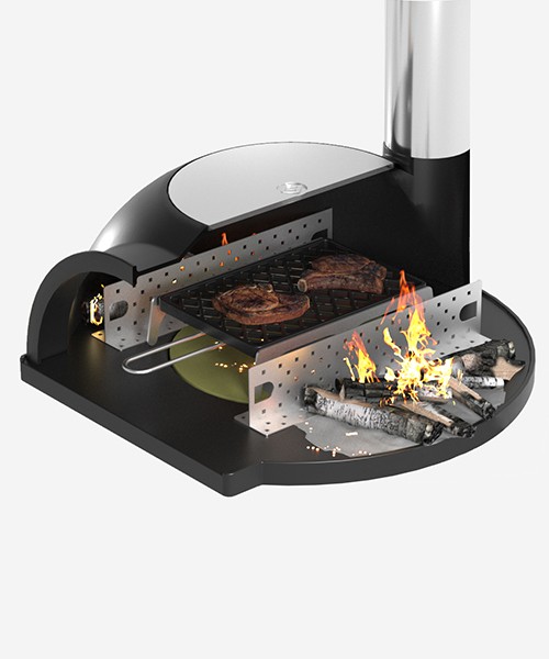 Металлическая конструкция из нержавеющей стали AISI 430 толщиной 2 миллиметра нужна для того, чтобы готовящиеся в универсальной садовой печи продукты как можно меньше загрязнялись углём и пеплом. Сталь не выделяет вредных веществ при нагревании, не деформируется и отлично противостоит продуктам горения дров или древесного угля. Для нормального движения нагретого воздуха в разделителе предусмотрено множество мелких отверстий, полученных с помощью лазерной резки.