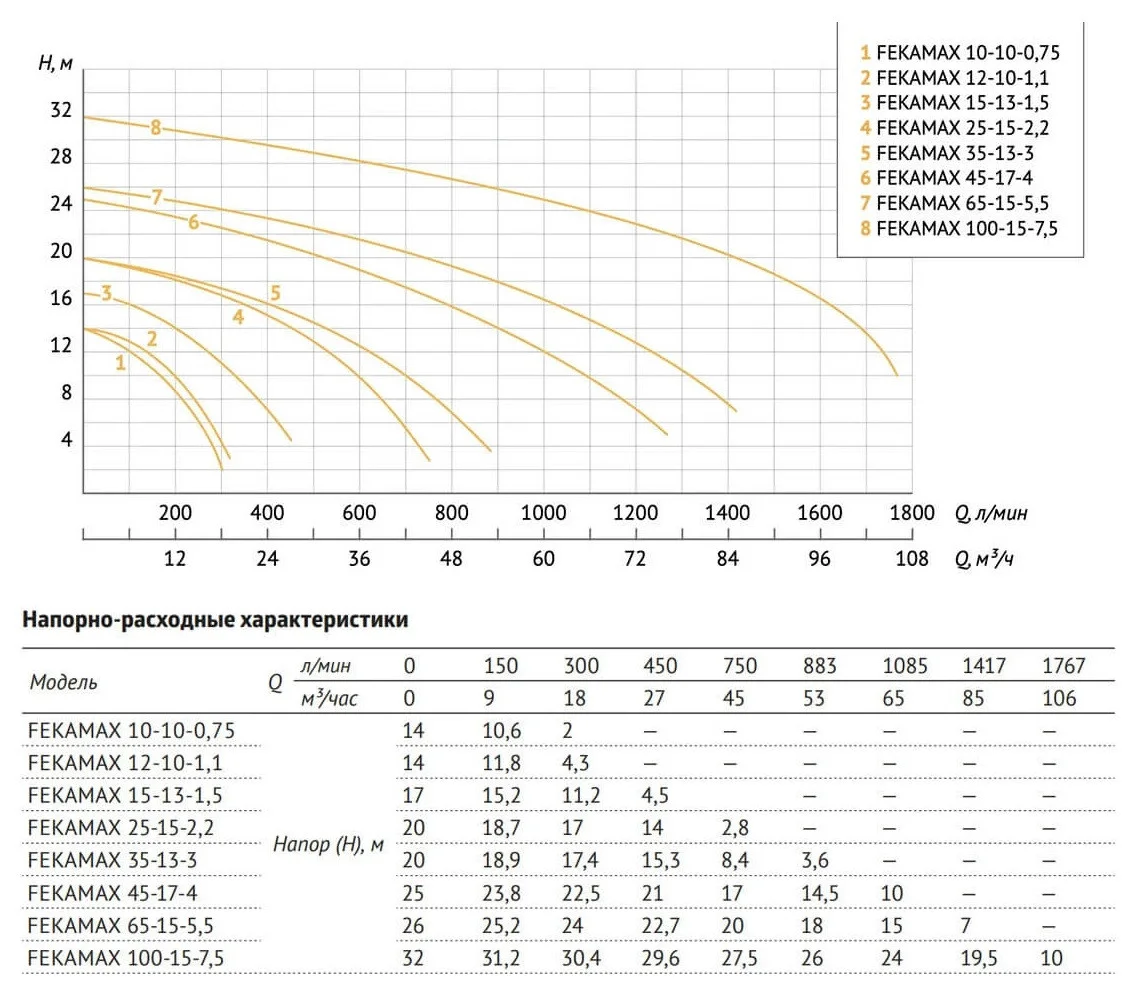 * — приведенные данные по максимальному напору и максимальной производительности справедливы при напряжении электросети 220 В, минимальной загрязненности и вязкости перекачиваемой жидкости, а также при минимальных сопротивлениях в напорной магистрали.