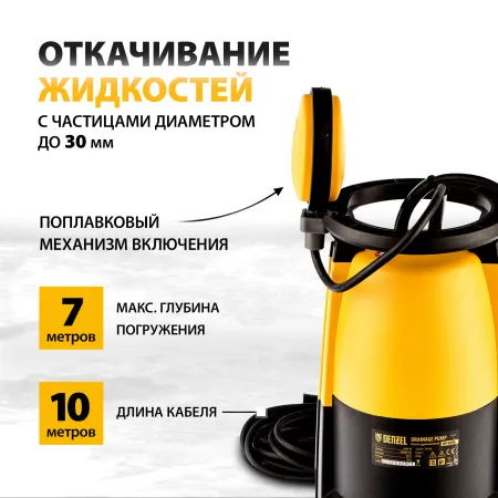 Дренажный насос Denzel DP-900S мощностью 900 Вт и производительностью 18000 л/ч обеспечивает напор 9 м и эффективно справляется с выкачиванием из затопленных помещений грязной воды с фракциями диаметром до 30 мм. Также используется для подачи чистой воды из колодцев и водоемов или организации системы полива сада и огорода. Благодаря небольшим габаритам подходит для установки в узких колодцах.