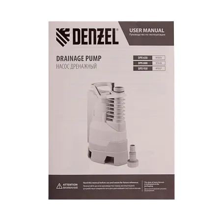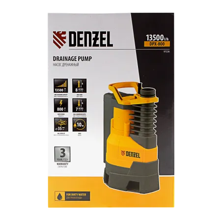 Дренажный насос Denzel DPХ800, погружной, пластик, мощность: 800 Вт, производительность: 13.5 м³/ч, максимальный напор: 8 м, глубина погружения: 7 м