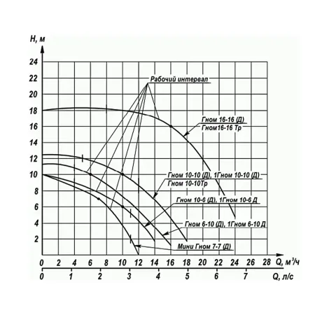 Электронасосы центробежные погружные типа Гном предназначены для откачивания загрязненных вод температурой до 35ºС (исполнение Ex взрывозащищенные – до 40 ºС, исполнение Тр – до 60 ºС), плотностью до 1100 кг/м3, при содержании твердых механических примесей до 10 % по массе с плотностью твердых частиц не более 2500 кг/м3 и максимальным размером до 5 мм.