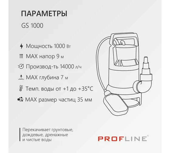 Дренажный насос PROFline GS 1000, пластик, центробежный, погружной, производительность 14 м3/час, мощность 1000 Вт, высота подъема 9 м, глубина погружения 7 м