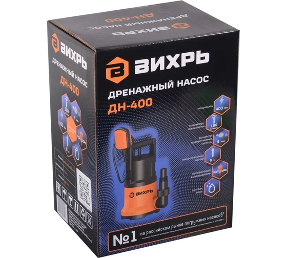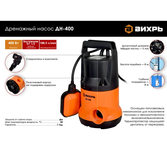 Дренажный насос Вихрь ДН-400 используется для осушения искусственных и естественных водоемов и емкостей, откачивания чистой воды из затопленных помещений, подвалов, бассейнов. Высокая производительность обеспечивает максимальную скорость подачи жидкости 188 л/мин. Высота водяного столба составляет до 8 м. Нижний тип забора воды позволяет использовать насос при низком ее уровне. Диаметр частиц, содержащихся в примеси, может составлять до 5 мм.