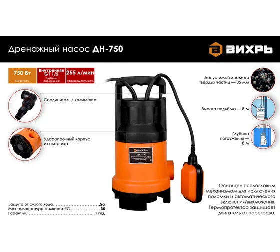Вихрь ДН-750 — это дренажный насос мощностью 750 Вт для перекачки загрязненной воды из естественных водоемов, оросительных каналов и дренажных колодцев, затопленных жилых помещений и подвалов. Допустимый размер пропускаемых механических частиц - до 35 мм. Использование в воде с более крупными включениями изнашивает рабочие части насоса и может привести к заклиниванию рабочего колеса.