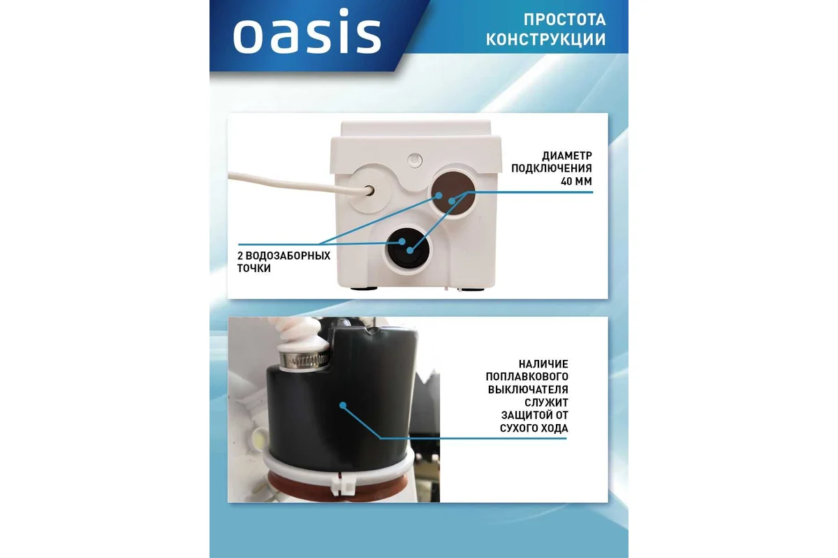 Канализационная установка Oasis SD-250, пластик, производительность 80 л/мин, напор 4 м, мощность 250 Вт, класс защиты IP54