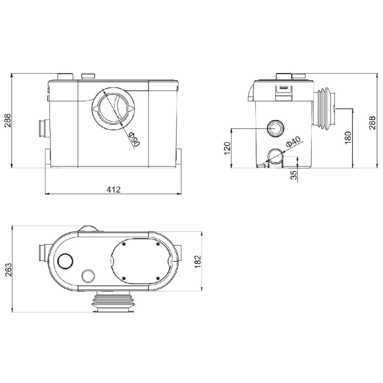 Оснащенная режущим механизмом, готовая к подключению автоматическая малогабаритная напорная установка для водоотведения, соответствующая стандарту EN 12056-4 с измельчителем, всеми необходимыми управляющими устройствами, обратным клапаном, фильтром с активированным углем, упругим поворотным напорным штуцером.