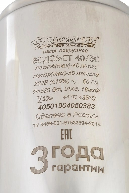 Насос погружной Джилекс Водомет 40/50 ок, скважинный, центробежный, нержавеющая сталь, производительность 40 л/мин, мощность 520 Вт, напор 50 м, класс защиты IP68