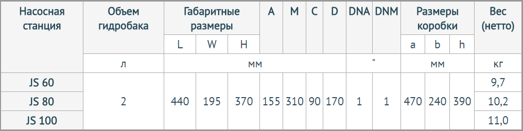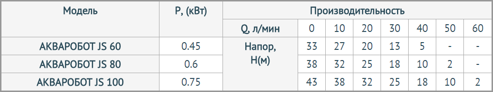 * — приведенные данные по максимальному напору и производительности справедливы при нулевой глубине всасывания и напряжении электрической сети 220В±10%.