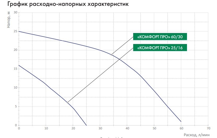 Расходно-напорные характеристики насосов-автоматов зафиксированы в названии с помощью буквенно-цифрового индекса. В названии модели «КОМФОРТ ПРО» 25/16: