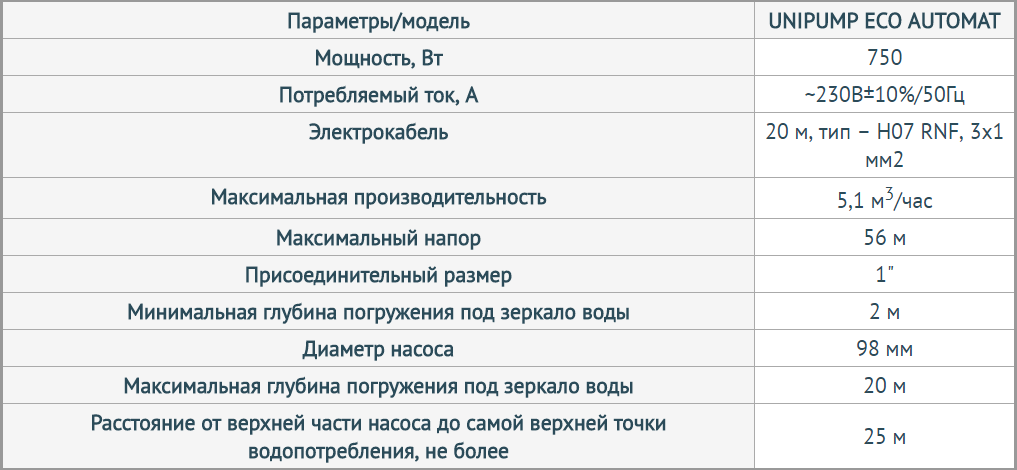 Насос скважинный погружной UNIPUMP ECO AUTOMAT центробежный многоступенчатый с корпусом из нержавеющей стали для водоснабжения; мощность 750 Вт, длина кабеля 20 м