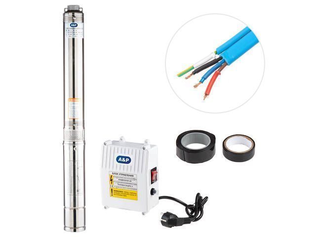 Насос скважинный центробежный A&P AGELESS-3-2100/43-2/15, нержавеющая сталь, мощность 370 Вт, кабель 2 м, производительность 45 л/мин, максимальный напор 64 м