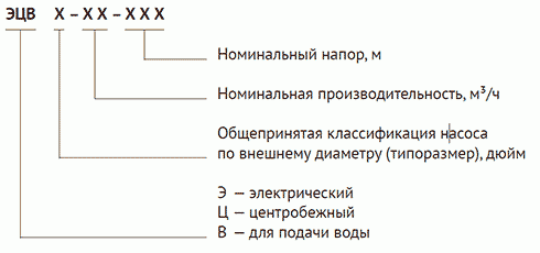 Серия ЭЦВ — погружные центробежные многоступенчатые насосы. Корпус насоса выполнен из нержавеющей стали. Напорный патрубок, адаптер, переходник, фланец и крышка изготовлены из чугуна. Электродвигатель — трехфазный, маслонаполненный. Герметизация электрического кабеля во фланце двигателя (переходнике) выполнена с помощью кабельного ввода. Рабочие колеса «плавающие», выполнены из высокопрочного, износоустойчивого полимера. Такая конструкция и используемый материал обеспечивают продолжительный срок службы проточной части и уменьшают вероятность заклинивания при перекачивании воды с механическими примесями. В верхней части насоса (проточной части), в напорном патрубке имеется выходное присоединительное отверстие с внутренней резьбой для соединения с напорным трубопроводом, проушины для крепления страховочного троса, а также встроенный обратный клапан. Всасывающее отверстие располагается в средней части насоса и защищено фильтрующей решеткой.