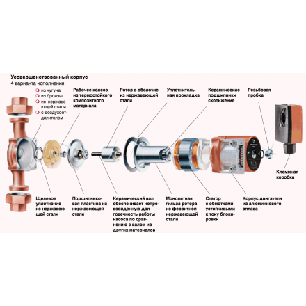 Система керамических подшипников обеспечивает долговечность и бесшумность насоса вследствие высокой твердости и низкого коэффициента линейного расширения керамики.