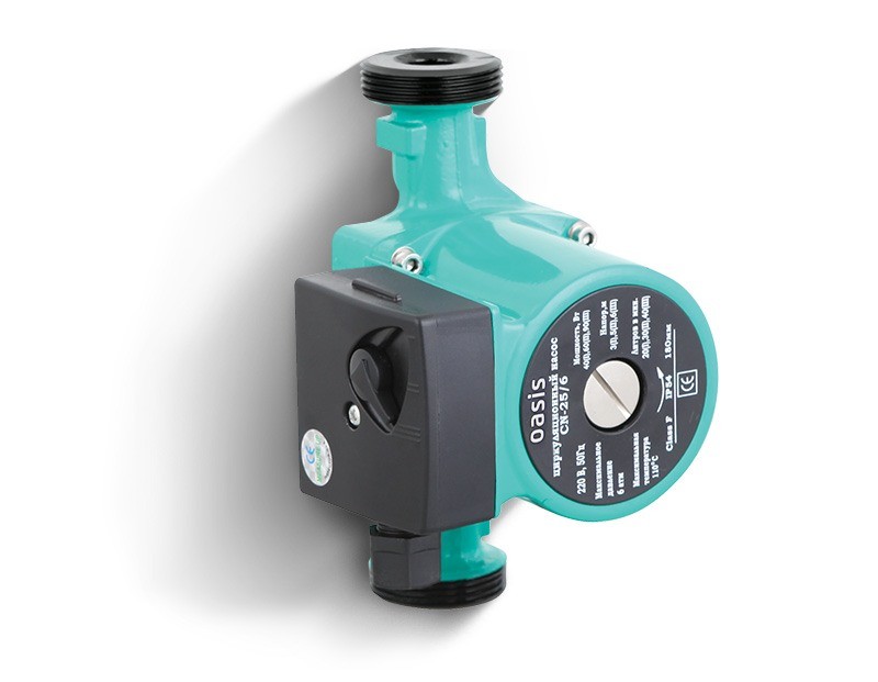 Циркуляционный насос Oasis служит для полноценной циркуляции теплоносителя в замкнутых автономных системах общего отопления и нагрева поверхности полов в частных жилых и малых промышленных строениях. Запитывается от однофазной сети переменного тока 22 В 50 Гц. Корпус изготовлен из чугуна. В насосах с мокрым ротором все движущиеся части, в том числе и ротор двигателя, омываются перекачиваемой жидкостью. За счёт этого процесса жидкость охлаждает подшипники скольжения и ротор, благодаря чему увеличивается срок службы прибора.