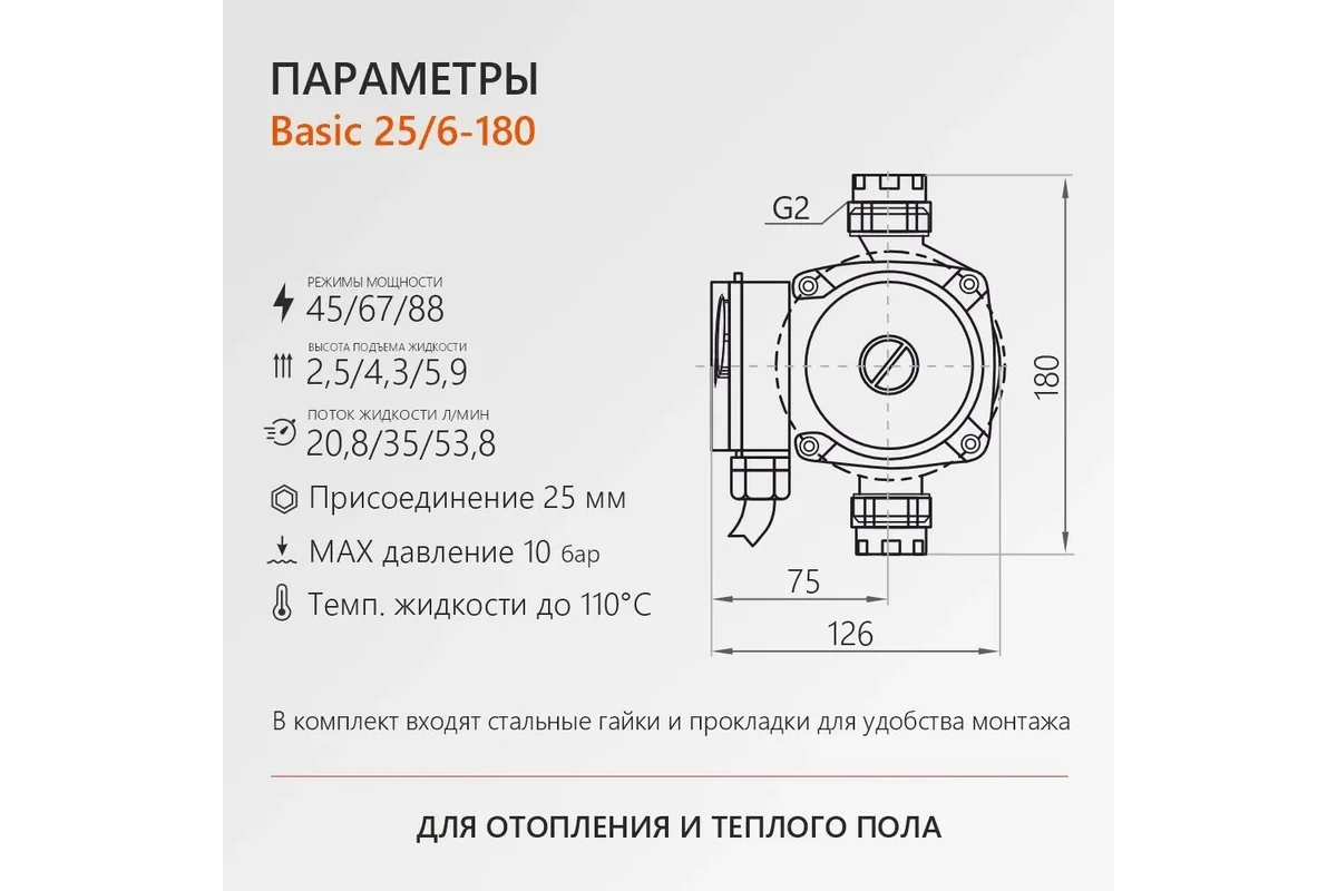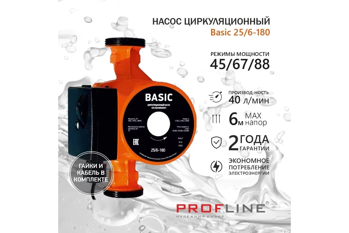 Насос циркуляционный Profline Basic 25/6-180 (гайки, кабель), максимальный напор 6 м, производительность 40 л/мин, мощность 88 Вт, класс защиты IP54
