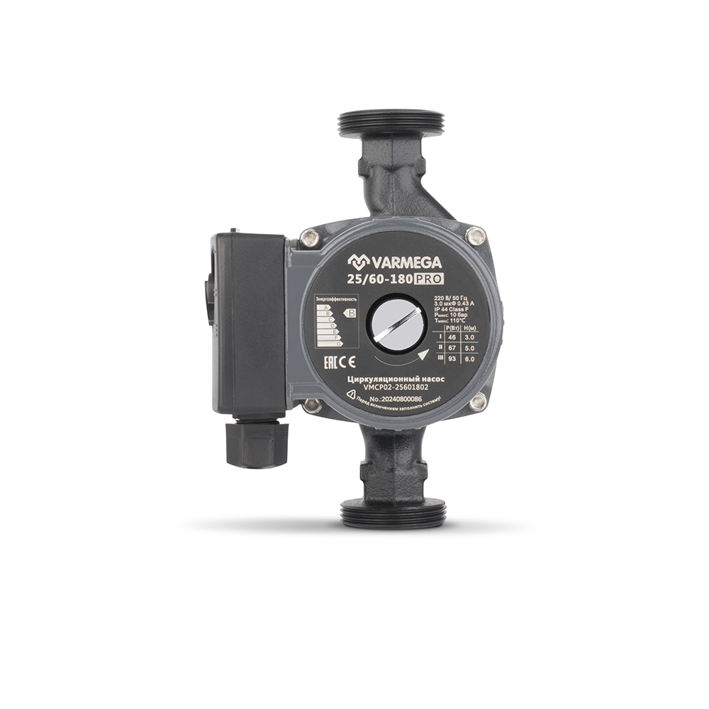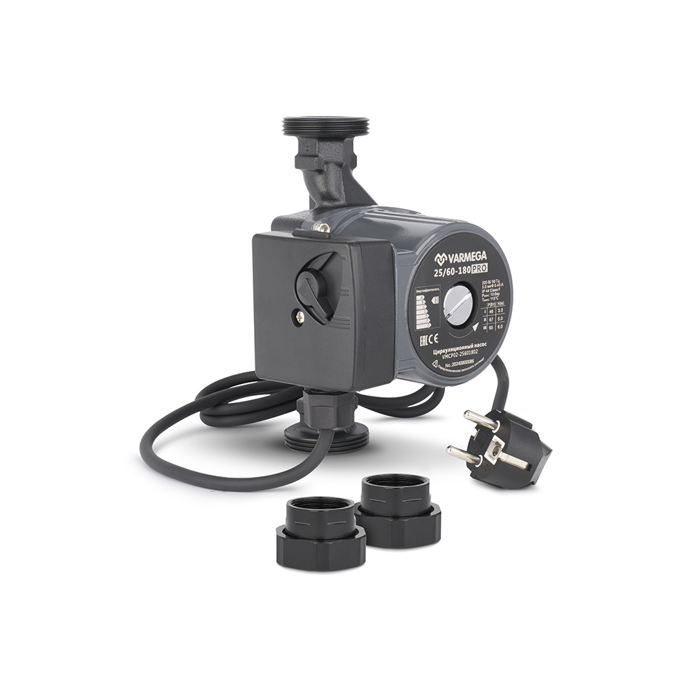 Насос циркуляционный Varmega VMCP02 PRO 25/60 180 с гайками, максимальный напор 6 м, максимальная мощность 93 Вт, класс защиты IP44, горизонтальная/вертикальная установка