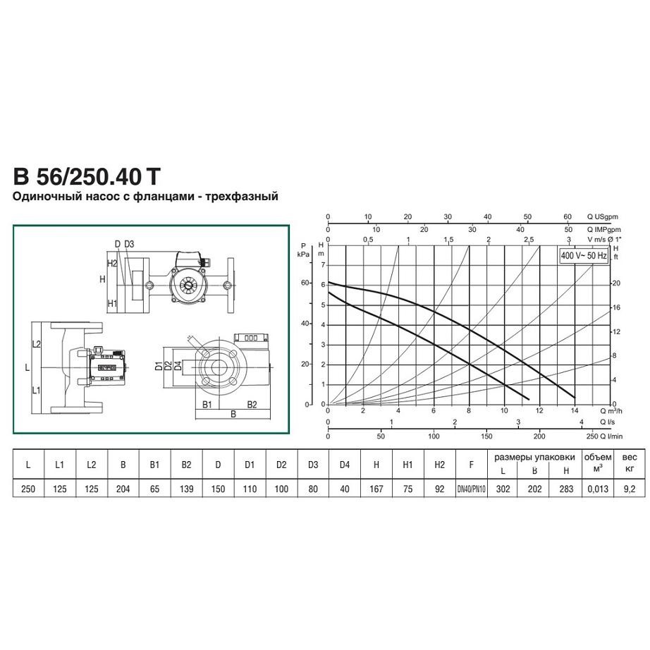 B 56/250.40 T - 400 v - насос для циркуляции холодной или горячей воды в небольших гражданских и промышленных системах отопления и кондиционирования с закрытыми мембранными или открытыми расширительными баками. Напор – 6 метра. Максимальная высота подачи: 6 м; Производительность: 200 л/мин; Максимальная мощность: 287 Вт; Страна производства: Италия; Срок гарантии: 12 мес