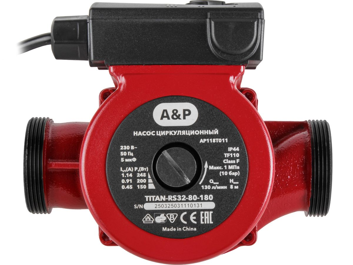 Циркуляционный насос A&P Titan-RS32-80-180, центробежный, чугун, максимальный напор 8 м, производительность 7.8 м³/ч, мощность 248 Вт, мокрый ротор